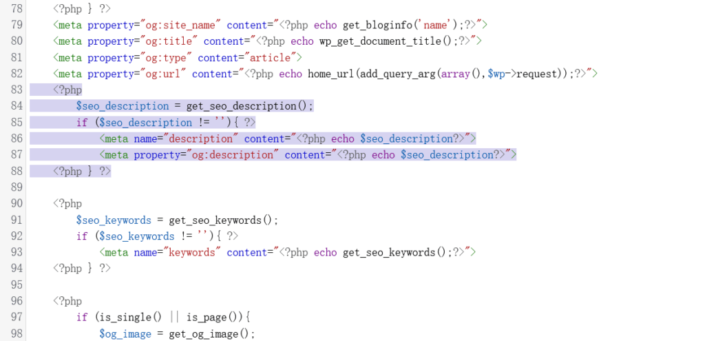我们找到主题页眉这个文件(header.php),在第83行左右找到下面的代码,并删除。(这部分是argon生成description的代码)