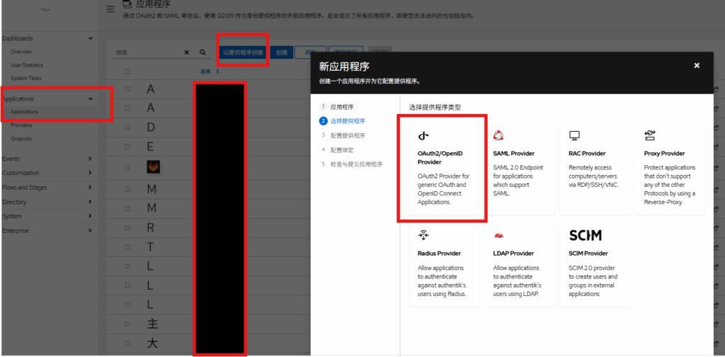 首先在Authentik中新建一个应用,这里就长话短说,在管理员面板后,点击左侧的Applications(应用)=》Applications,点击以提供程序创建,创建流程中当在“选择提供程序“这个阶段的时候,请选择Oauth2/OpenIDprovider,如下图。创建的时候记得考备出来客户端ID以及客户端Secret