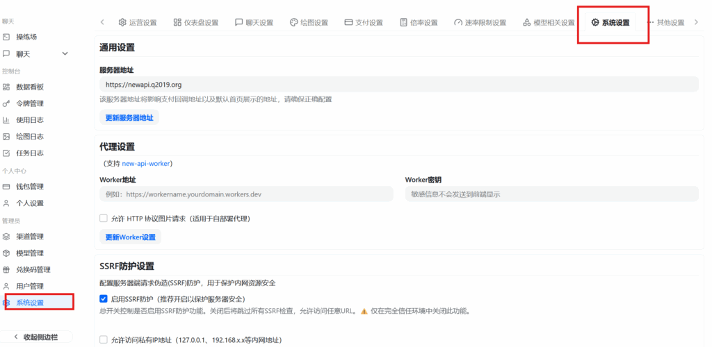 获取完上述信息之后,我们前往newapi的网页,在管理员账号下面,选择左侧栏中的系统设置,在右侧界面进入设置界面后,再次点击系统设置(注意,这里的系统设置是在上面页签处!如下图!)