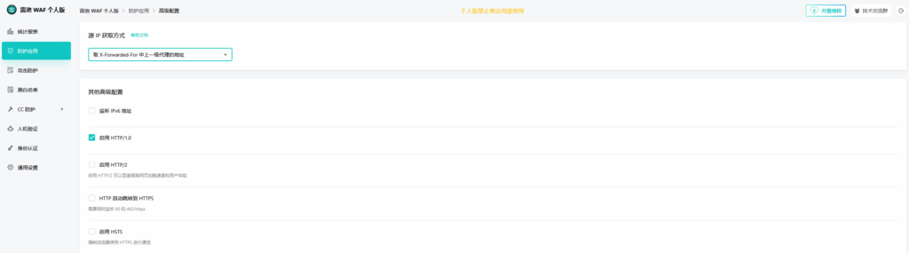 步骤二:在雷池中配置,设立应用(其实就是站点),应用上游设置为127.0.0.1:8000(就是刚刚的端口),应用绑定端口设置为127.0.0.1:8001(此端口也不要让非本机能访问)。并且雷池中不要有任何应用(站点)绑定了80或443端口!(雷池可以无需80,443端口运行)。请注意!雷池也需要在防护应用-高级配置-源IP获取方式这个地方将获取方式调整为“取X-fowrd上一级的地址”,如下图,否则雷池的防护无法正确的工作!