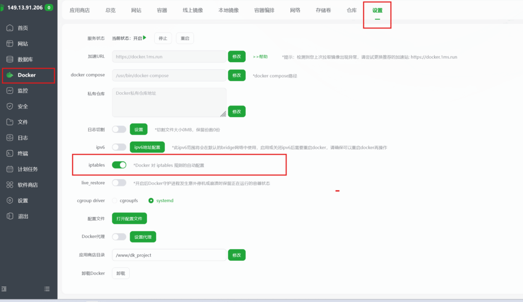 如果是宝塔面板的用户的话,可以直接左侧栏docker=>上方设置=>iptables开关,将这个开关关掉。(这会重启容器),如下图所示