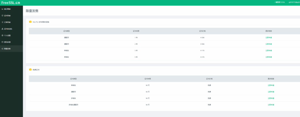注册账号登录后,前往后台的证书列表,点击申请证书,界面如下图。(请注意,只有单域名的90天是免费的,其他的选项,全部都要跳转51ssl.com 然后需要付费)