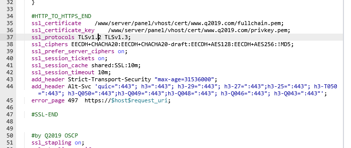 add_header Alt-Svc 'quic=":443"; h3=":443"; h3-29=":443"; h3-27=":443";h3-25=":443"; h3-T050=":443"; h3-Q050=":443";h3-Q049=":443";h3-Q048=":443"; h3-Q046=":443"; h3-Q043=":443"';