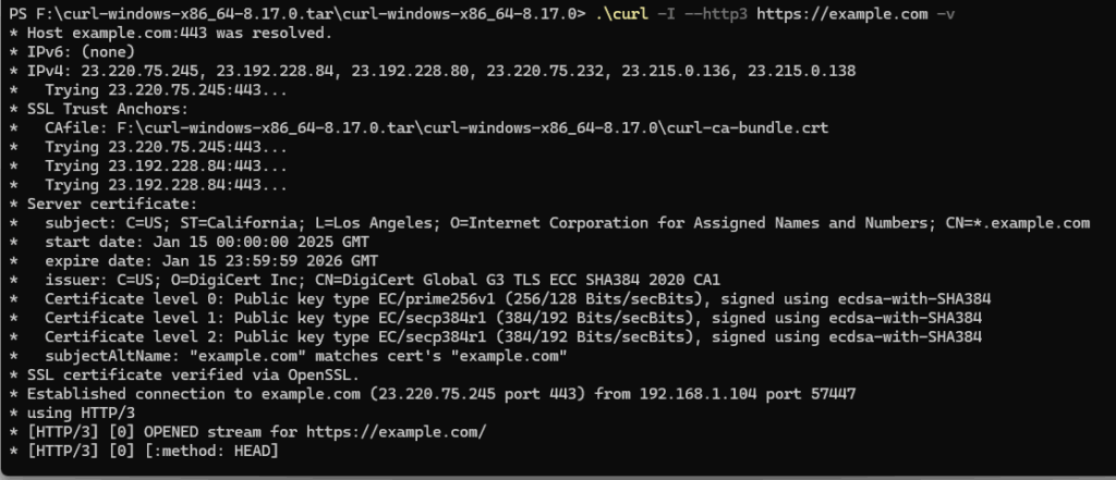 C:\Users\q2019>curl -I --http3 https://example.com curl: option --http3: the installed libcurl version does not support this curl: try 'curl --help' for more informatio