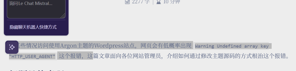 火狐在某一个版本更新之后,出现了这个AI对话按钮,当我们选中一些文本的时候,这个按钮就会弹出,但是这个按钮有时候会挡住我们需要的其他的功能(比如我用的划词翻译)。这篇文章就是介绍下如何通过about:cofig关闭这个Firefox的AI悬浮按钮
