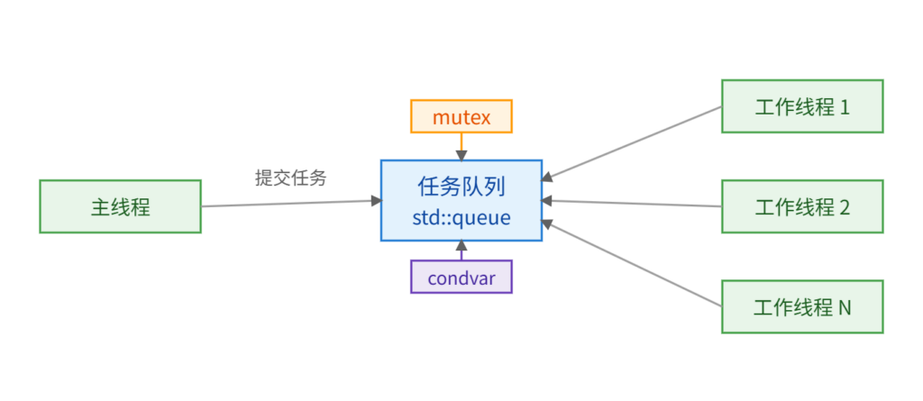 中间是一个std::queue<std::function<void()>>类型的任务队列,队列上方挂着一把std::mutex负责互斥访问,下方挂着一个std::condition_variable,用来让工作线程在队列为空时进入等待状态。左侧的主线程负责往队列里提交任务:拿锁、push任务、解锁,然后调用notify_one()提醒某个工作线程可以醒来干活。右侧则是由若干个工作线程,它们在一个循环里,先拿锁,如果队列为空且没有停止信号,就调用wait()在条件变量上睡觉,被唤醒后重新拿锁,从队列里取一个任务,把锁释放,然后再自己的栈上执行这个任务。这样一来,线程数量是固定的,任务数可以很多,而且不会忙等浪费CPU。