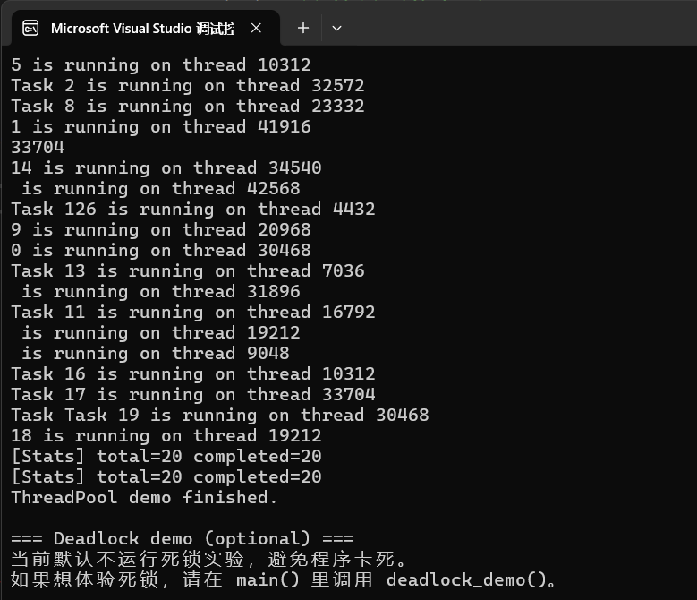 同样的在线程外,我们再定义一个stats结构体,用一把单独的mutex保护两个计数器,total_tasks记录提交的任务数,completed_tasks记录已经执行完成的任务数。每当主线程调用submit()提交任务时就调用一次on_task_submitted()加一,每个任务执行完后调用一次on_task_completed()加一,结束的还可以看到类似这样的[Stats] total=20 completed=17的统计信息。