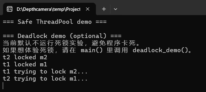 std::cout << "当前默认不运行死锁实验,避免程序卡死。\n";