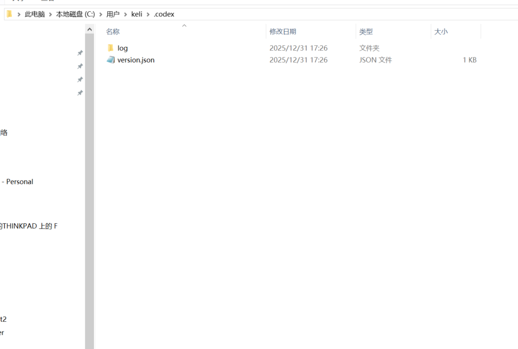 首先先执行一次codex(必须要执行一次,否则根目录是不会生成配置文件),然后可以看到用户目录下面出现了一个.codex文件夹,如下图。