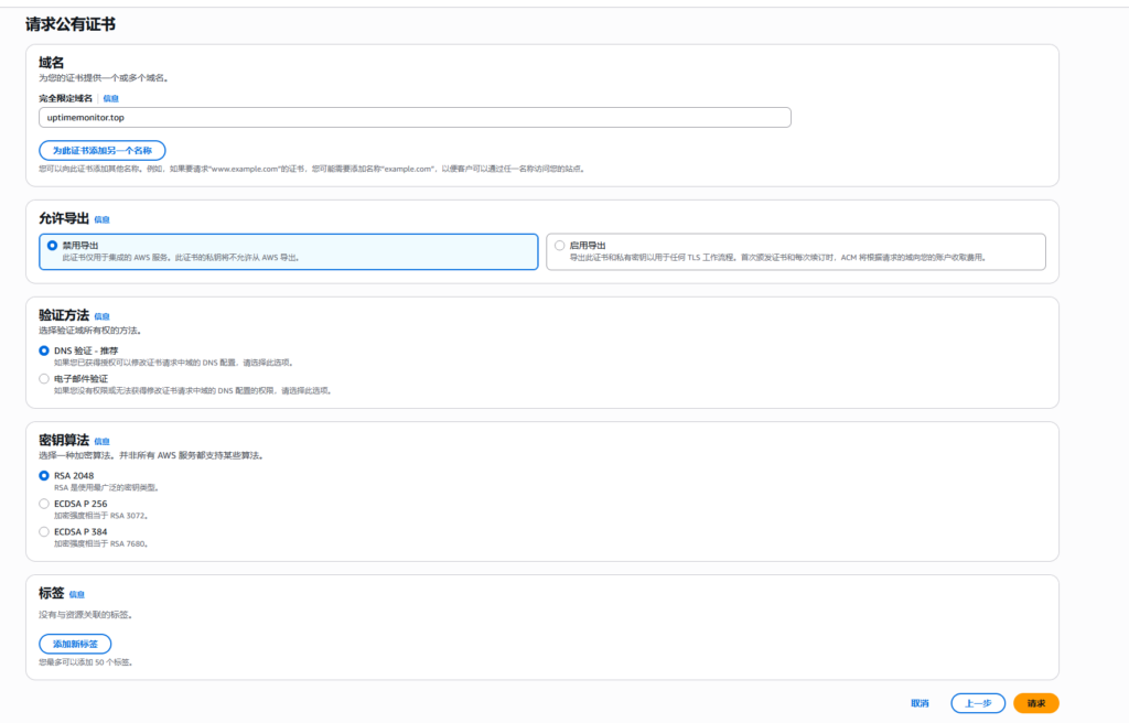 然后一路下一步,直到下图中的界面,如果不想被收费的话,一定要选择禁用导出!(关于这个的价格,可以查看https://aws.amazon.com/cn/certificate-manager/