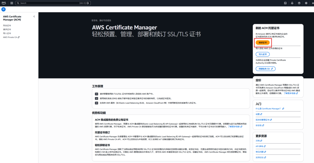 要使用CDN,肯定要先去弄ssl证书。CloudFrontCDN使用的是AWS Certification Manager的证书。首先将账号切换到美国 弗吉尼亚北部(证书必一定要是在这里us-east-1),也可以直接点这个链接https://us-east-1.console.aws.amazon.com/acm/home?region=us-east-1#/welcome 如下图,点击请求证书按钮