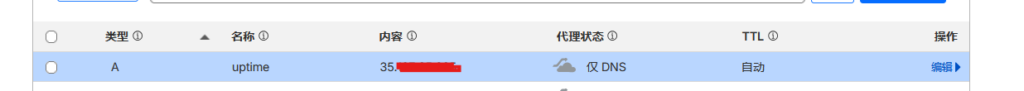 说下为什么这么做,因为CloudFront强制要求源站的地址必须是可解析的域名(详见https://docs.aws.amazon.com/AmazonCloudFront/latest/DeveloperGuide/DownloadDistValuesOrigin.html),而不能直接填写一个单纯的IP地址,所以我们需要额外解析域名到源站上面(如果源站已经有其他解析记录,可以忽略本步骤)。(我这里以uptime.example.com举例子)。(这里还要提到一点,虽然在源站地址填写的是uptime.example.com,但是cloudFront默认情况(没有手动配置转发策略的情况下)下发送的回源HOST头不是uptime.example.com,而是我们自定的cname地址,本文中是uptimemonitor.top)