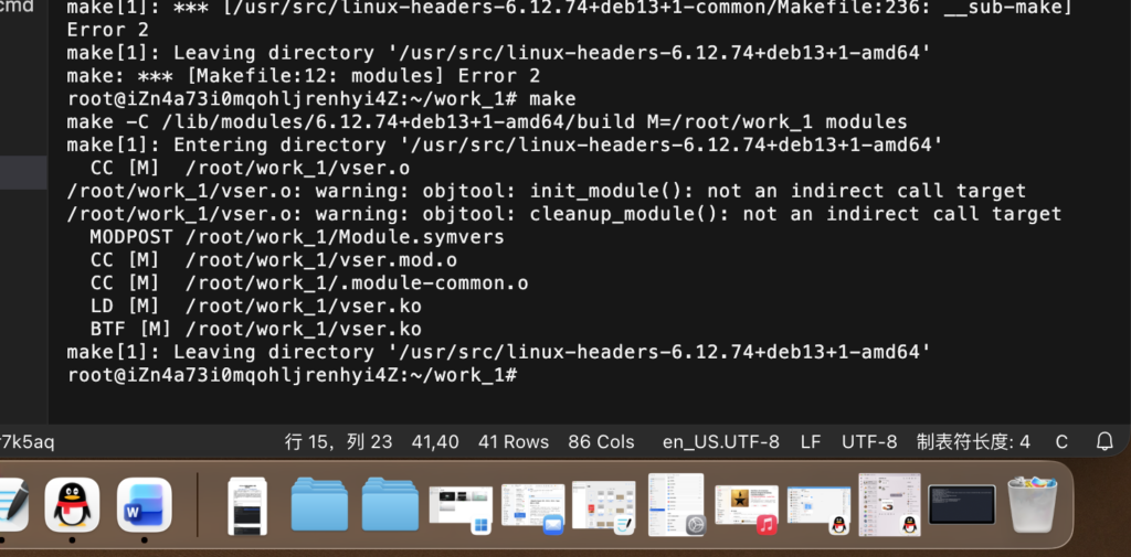 make\[3]: \*\*\* \[/usr/src/linux-headers-6.12.74+deb13+1-common/scripts/Makefile.modpost:145: /root/work\_1/Module.symvers] Error 1